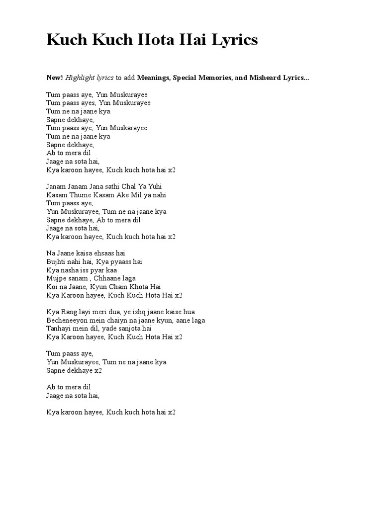 English Translation Kuch Kuch Hota Hai Lyrics - Tum paas aaye, yoon muskuraaye. English Translation Kuch Kuch Hota Hai Lyrics : The clip can be played from any line of lyrics!